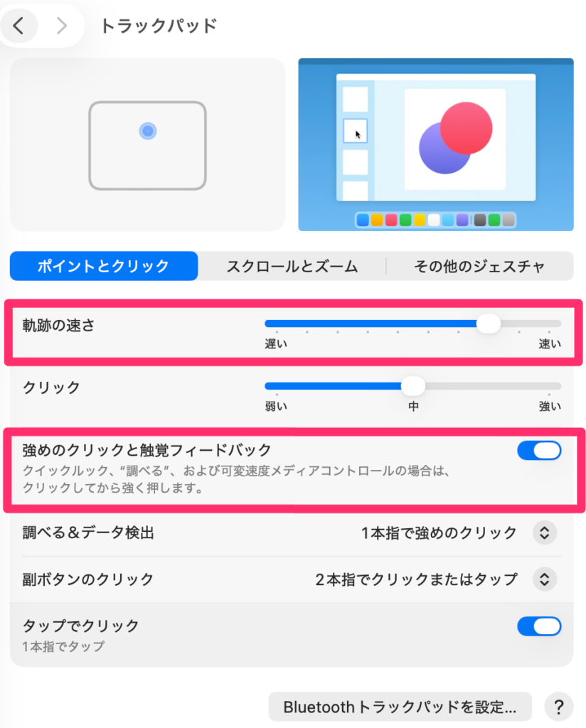 設定 → トラックパッド → “強めのクリックと触覚フィードバック” をオンにする & ”軌跡の速さ”を上げる