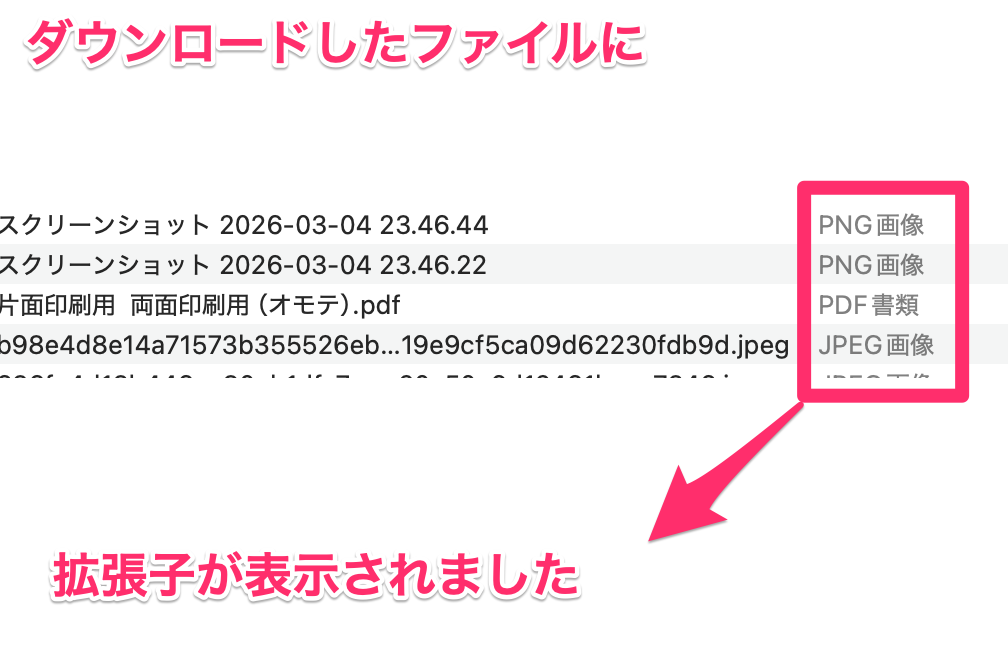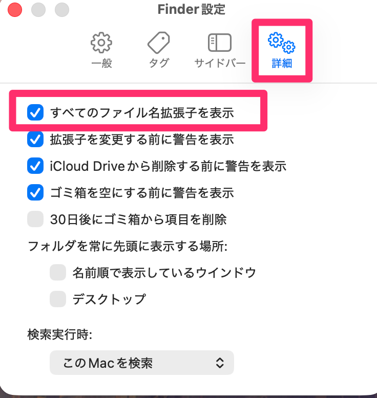Finderを開く → メニューバー「Finder」→ 設定 → 詳細 →「すべてのファイル名拡張子を表示」にチェック